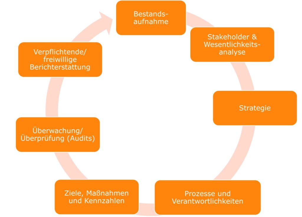 In der Regel steht am Anfang eine Bestandsaufnahme der Aktivitäten und Strukturen im Unternehmen. Anschließend kann der Aufbau einer Strategie und eines Managementsystems erfolgen, z.B. anhand bestehender Managementsystem-Normen.